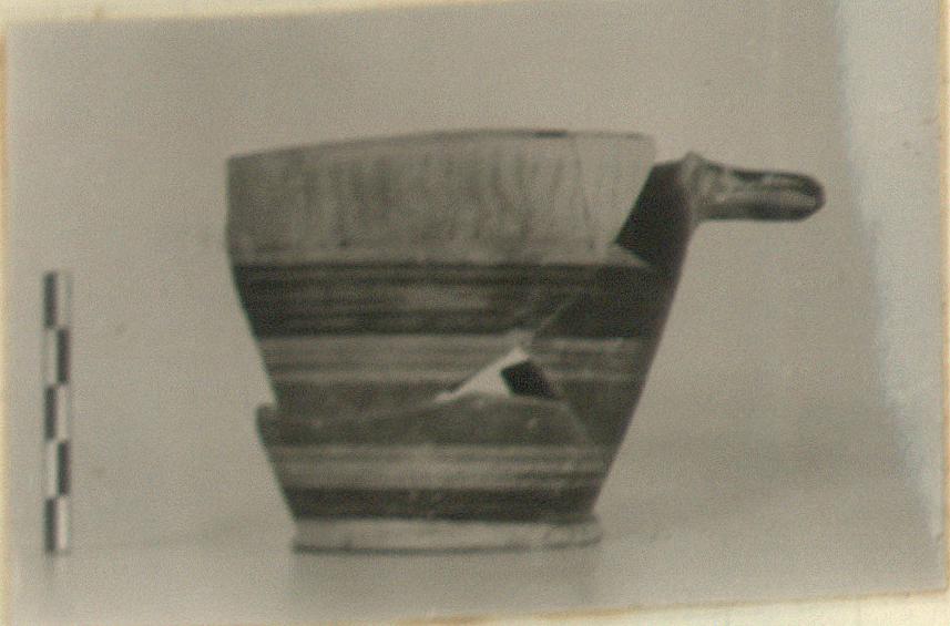 | Description: | One handle and fragments of rim and walls missing. Traditional shape. Glaze inside dull black. Decoration outside and beneath in red and black bands. Zone of wavy verticals at rim. Corinthian Conventionalizing. | |