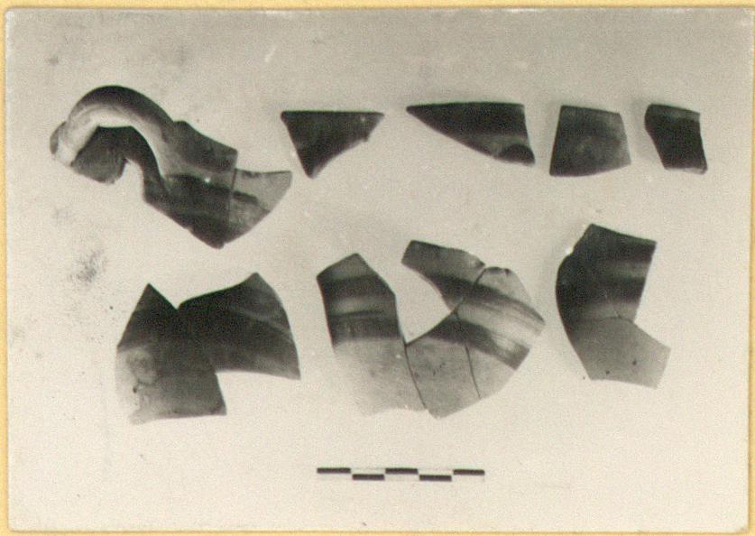 | Description: | Fragments of a skyphos of uncertain type; plain rim slightly flaring; nothing of bottom preserved. Restored in plaster. Thin fabric. Unglazed, except for a band at rim, inside and out, the outside of the handle, and a broad band (or double band: very irregular) below handles. Thin streaky glaze. | |