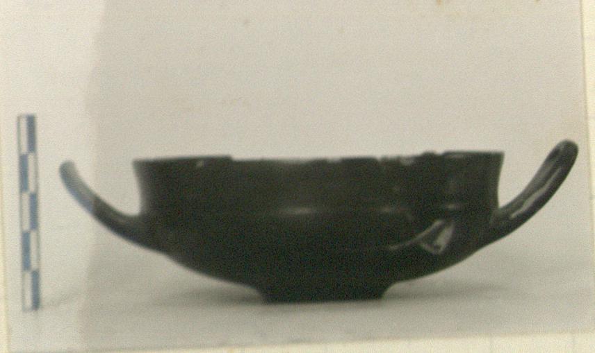 | Description: | A little of rim and wall, and part of one handle, missing. Small and light version of P 24587 (ΣΑ 2797); the plain raised base continuous with the wall and slightly concave beneath. Reserved: handle spaces and insides of handles; bottom of base; some dilute glaze wash. Glaze fired mostly chocolate-brown. | |