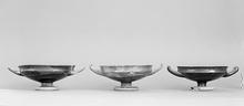 | Description: | Fragments from rim missing. Somewhat similar to the last, but smaller and with a well defined stem; a ring around it, above the foot, set off by two scratched lines. Reserved: handle spaces and insides of handles; edge of foot and resting surface; space at center of conical underside of foot. Carelessly glazed and fired; on the foot, the glaze runs down in places over the reserved outer face. Upper part of exterior fired and mottled gray. | |