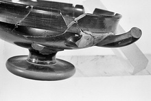 Description:   Much of floor, a little of rim and part of one handle missing. Like P 24597 (ΣΑ 2807), but with a single glaze circle only inside the foot cone.