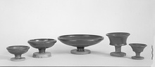 | Description: | Complete except for chips. Heavy rolled rim projecting, set off below by a scratched line; a second line around the lower wall, and a pair setting off a light ridge just above foot. Broad, thick disk foot, the outer face nearly vertical; inside the resting surface the bottom is recessed: more a skyphos than a cup foot. Reserved: edge of foot and resting surface, and space inside foot, this decorated with a broad and a narrow glazed band near the outer edge and a circle and dot at the center. | |