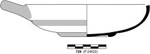 | Description: | Several fragments preserve center of floor with foot and part of floor and rim, with handle. Large and shallow, with a low bevelled foot ring and a cup handle rising above the rim. The inside glazed, but the rim reserved, and a disk at the center of the floor with central circle and dot. Broad glaze band around wall outside, and the sloping outer face of the foot glazed, but not the resting surface. Within the foot, a broad and a narrower glazed circle around a central dot. | |