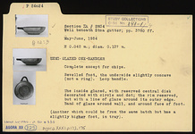 | Description: | Complete except for chips. Bevelled foot, the underside slightly concave (not a ring). Loop handle. The inside glazed, with reserved central disk decorated with circle and dot; the rim reserved, but with a line of glaze around its outer edge. Band of glaze around wall, and around face of foot. (Another which could be from the same batch but has a slightly higher foot, in tray.) | |