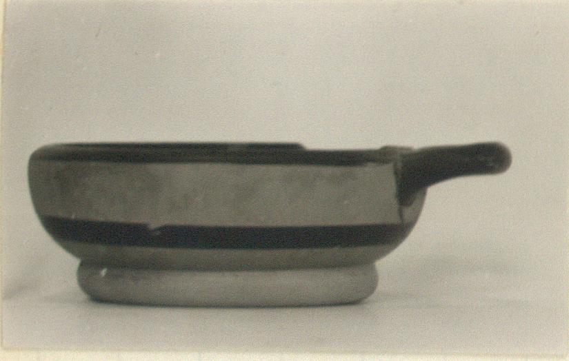 | Description: | Small piece of rim and wall missing. Substantial torus ring foot; heavy fabric, the walls rounding in slightly to the rim, which is flattened and slopes gently outwards; stubby U-handle. Carefuly made and glazed. Inside and rim glazed; reserved disk at center of floor with two circles and dot close to center. Outside, glazed band on wall, and on inner face of foot only. Two small circles and dot at center beneath. Cf. Agora XII, no. 735. This and P 24630 - P 24632 (ΣΑ 2840 - ΣΑ 2842) are identical except for minute variations in the dot and circle decoration. All seem new and unused. They are inventoried to suggest that the Stoa Lekythos Shop sold other wares besides figured and glazed (all four from containers 13, 14, 16 and dump). | |