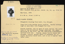 | Description: | Fragments missing from wall; lip chipped. Restored in plaster. Ring foot with double torus profile; rim flanged for lid; double string-lugs on shoulder. Glazed outside and to base of neck inside; the outer face of the horizontal flange reserved, the upper moulding of the foot, and the underside, considerably mottled with red. Inside, glaze fairly heavy but streaky, overall except where it happened not to reach; directly below neck, and in an irregular band lower down. | |