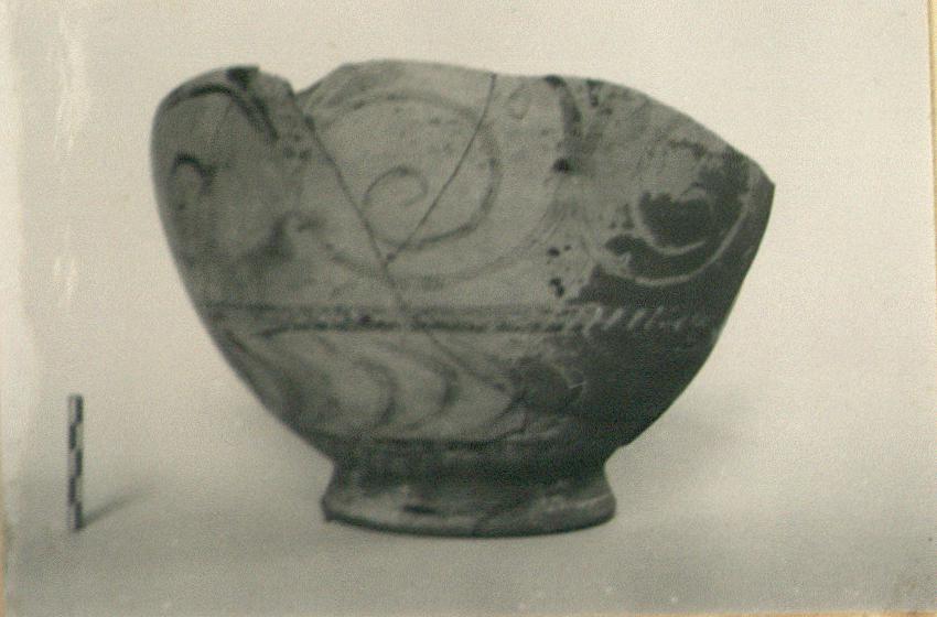 | Description: | "Fikellura" Amphora. Mended from several pieces. Foot and most of lower half preserved. Ring foot slightly flaring. Wide zone of scrolls with palmettes; below, narrow band of blobs, then a zone of crescents leftwards, then rays around base. On foot, a narrow band of blobs. Mauve-brown clay with grits. The dull glaze of the decoration has faded and the white slip largely flaked. Cf. BSA 34 (1933-1934), pp. 30-33: volute zone group. | |