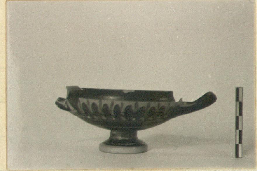 | Description: | Mended from many pieces; one handle, most of rim and upper walls missing, but full profile given. Spreading thick foot with wide flat resting surface; slight ring at junction of foot; offset rim. Zone of degenerate palmettes; reserved band lower below. Side of foot, resting surface, top of inside of foot and one thin band inside rim, are reserved. Red and white on palmettes. Dull thin glaze fired brown at places. | |