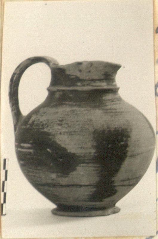 | Description: | Chips missing from lip. Plump body; sharply profiled ridge around neck; strap handle. Thin black-brown glaze, much flaked, with traces of two narrow purple bands around middle. | |