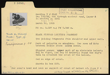 | Description: | Two joining fragments from shoulder and upper wall. Part of palmette on shoulder. Two rows of dots between double lines above scene. Figured scene: upper part of an elaborate helmet; dog to right (on top of helmet); around the dog's tail is attached the crest of the helmet. Red on edge of crest. Sherds in box 339. For swan's head and neck as support of crest of helmet, cf. Hesperia Suppl. X (1956), no. P 6 (Pl. 1). | |