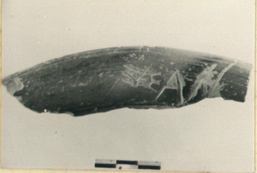 | Description: | Small segment of rim with turned down edge. Glazed on top of rim and inside; lower edge of rim and underside unglazed. Three crudely scratched letters: <graphic> Thin glaze fired red. Sherds in tin 376. | |