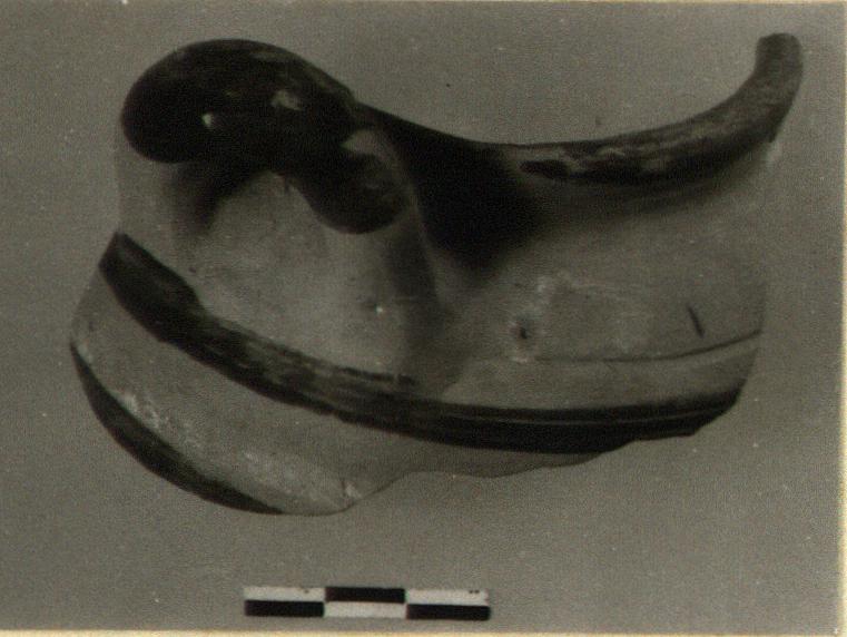 | Description: | Rim and one handle of small round-bodied pot, with two vertical loop handles set on shoulder just below vertical rim. Thin grayish-buff fabric. Bands of matte dark brown glaze on side, lip and top of handle. Traces o fwhite between the panels below the handle, and on the shoulder. Incrustation? Late Helladic III. | |