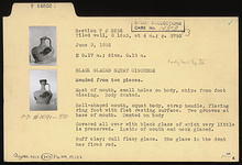 | Description: | [Originally identified as oinochoe.] Mended from two pieces. Most of mouth, small holes on body, chips from foot missing. Body dented. Flaring ring foot with flat resting surface; squat body; bell-shaped mouth; strap handle. Two grooves at base of mouth. Covered all over with black glae of which very little is preserved. Inside of mouth and neck glazed. Buff clay. Dull flaky glaze. The glaze in the dent has fired red. | |