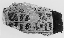 | Description: | Broken all around. A woman's right arm, with two bracelets in thinned clay, resting on a chest(?) or cushions(?). Firm black glaze on underside. Pink-buff clay. | |