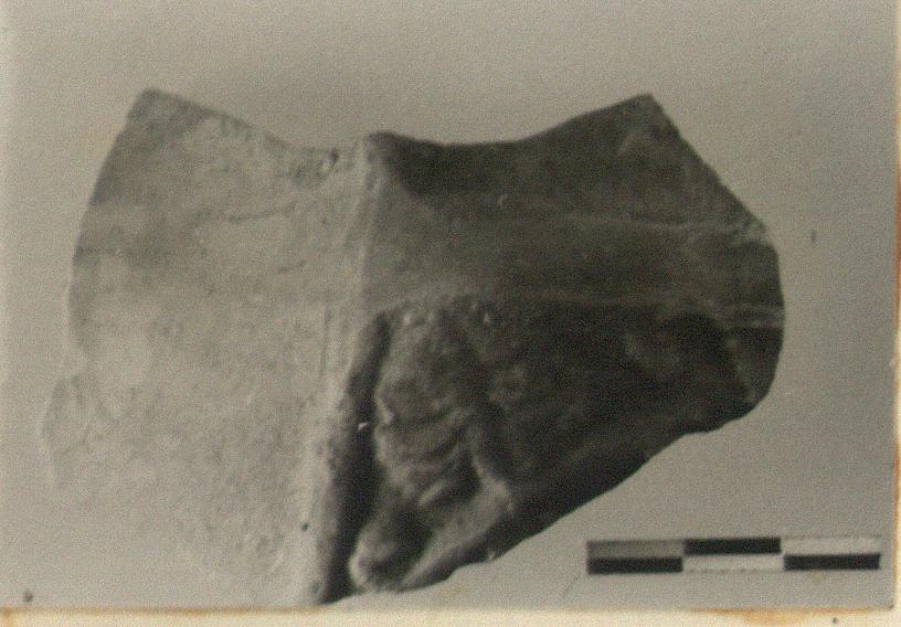 | Description: | Fragment of lower part of relief zone and of lower body. Relief decoration: vine tendrils. Rather gritty buff clay, fired gray at core; dull brownish-red wash. | |