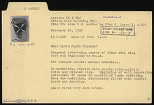 | Description: | Fragment preserving center of floor with ring foot and beginning of walls. Two scraped circles around medallion. In medallion, rosette with petals alternately white and diluted clay. Beginning of wall decoration preserved: appears to consist of bands radiating from the medallion, alternately filled with checkerboard and hatching. Glaze fired very dark brown. | |