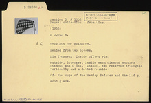 | Description: | Mended from two pieces. Rim fragment. Inside offset rim. Outside, lozenges, inside each diamond another diamond and a dot. Inside, two reserved triangles vertically and a dotted rosette. Good glaze. Cf. the cups of the Marley Painter and the Lid Painter. | |