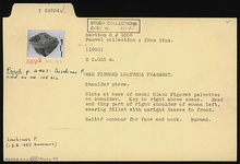 | Description: | Shoulder piece. Blobs at base of neck; black figured palmettes on shoulder. Key to right above scene. Head and tiny part of right shoulder of woman left, wearing fillet with upright leaves in front. Relief contour for face and neck. Burned. | |