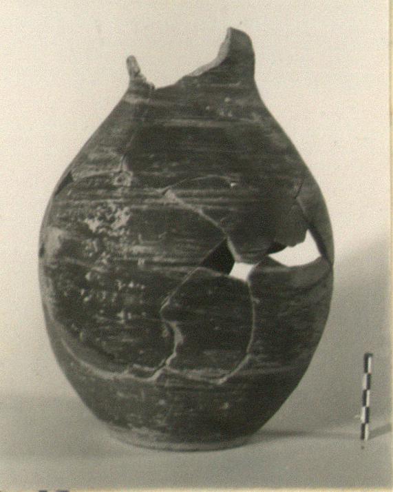 | Description: | Neckless oinochoe. Mended from many pieces; trefoil mouth and handle missing. Footless. Painted over all. Worn glaze. | |