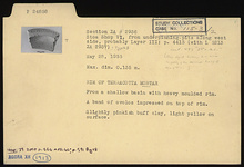 | Description: | Rim fragment. Shallow basin with heavy moulded rim. A band of ovolos impressed on top of rim. Slightly pinkish-buff clay, light yellow on surface. | |