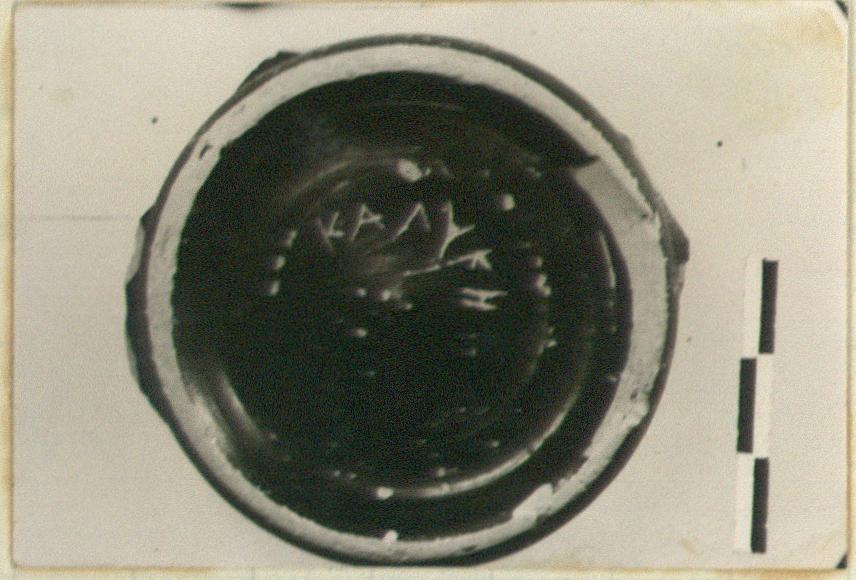 | Description: | Base only remains. On underside, within base ring, incised graffito: ΚΑΛΥΚΗ (<graphic>) Pink-buff clay. Glaze turned to greenish on the inside and much of it gone. | |