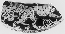 On downturned rim, egg pattern; on top, a griffin to right, a water bird to left; tendril in field, in front of griffin.