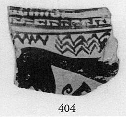 | Description: | Fragment from rim. On top of rim, groups of transverse bars; in cavetto just below rim, a band of staircase pattern bounded above by one and below by two red lines. On the wall, a beast in silhouette to right. Space fillers: zigzag lines and diamonds with tendrils. Pinkish-buff clay. Inside brownish-red glaze with a reserved line at junction of rim and wall. Outside red and brownish-black glaze. ADDENDA Agora Sample no. 520: spectographic analysis, Fitch Lab, June 1978. | |