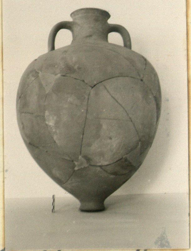 | Description: | Flaring rim set off by groove; finger impressions on lower attachments of handles. Rather broad shoulder; ring foot. Reddish-buff clay. Not smeared. Cf. P 12760 from B, Well near middle of Tholos. | |
