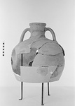 | Description: | Upper part only preserved. Partly restored in plaster. Flaring rim set off by groove. Finger impressions at base of handles. Buff clay. Smeared inside. | |