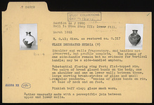 | Description: | Shoulder and walls fragmentary; handles not preserved; profile complete. Restored in plaster. The stumps of one side-handle remain but no evidence for vertical handle; may be a side-handled amphora. Substantial flaring ring foot; flat-topped rim. Two pairs of broad glazed bands on body, one on shoulder and one on lower wall; between these, large curving brush strokes of glaze and small irregular pendents. Remains of glaze bands on rim, at base of neck and on foot. Pinkish-buff clay. Glaze much worn. Rather coarsely made with a perceptible join between upper and lower walls. | |
