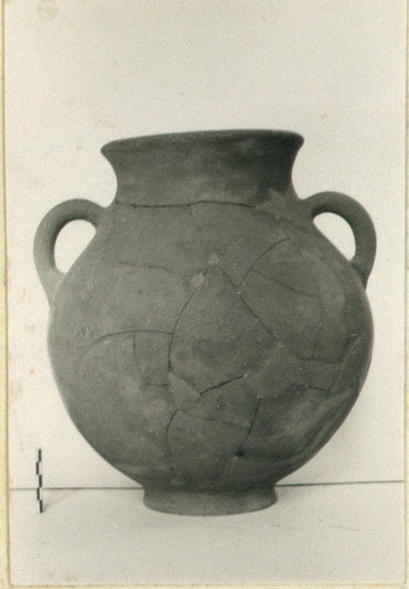 | Description: | Wall fragments missing; restored. Wide mouth; ring foot; rolled handles. Graffito on neck, below rim: <graphic> Fired grayish-brown. | |