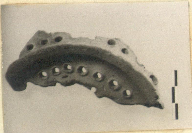 | Description: | Fragment preserving a little of ring foot, floor and lower wall; both floor and wall carefully pierced before firing. Micaceous coarse clay unevenly fired; brownish-light red-grayish. | |