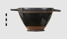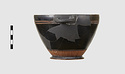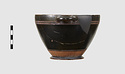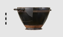 | Description: | One handle and fragments of body missing. Pair of red lines below handles and one above foot band. Rays in dilute glaze in band above foot. Bottom reserved with central dot and circle, and line around outer edge. Cf. Agora XII, no. 305. | |