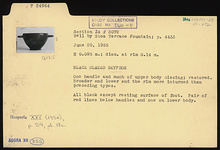 | Description: | One handle and much of upper body missing; restored. Broader and lower and the rim more inturned than P 24960-P 24963. All black except resting surface of foot. Pair of red lines below handles and one on lower body. | |