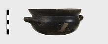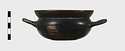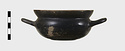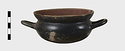 Description:   Part of one handle and fragment of lip missing. Offset lip. Two horizontal handles. Small flat bottom. Inside of lip reserved and decorated with added red. Bottom reserved with small black circle.