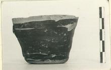 | Description: | Handles missing, otherwise intact. A small, crudely made cup of heavy fabric. Two horizontal handles. Flat bottom. Rim reserved with cross strokes. Irregular reserved band in handle zone. Reserved bottom. Dull black glaze. Subgeometric survival. | |