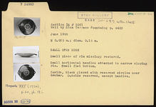 Description:   Small piece of rim missing; restored. Small horizontal handles attached to narrow sloping rim. Small flat bottom. Inside, black glazed with reserved circles near center. Outside reserved, except handles.