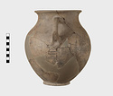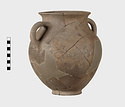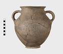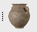 ADDENDA P 25004: Wide mouth; deep rounded body; low ring foot; rolled handles on shoulder with deep thumbprints at base. Grayish-brown cooking ware. Unglazed.