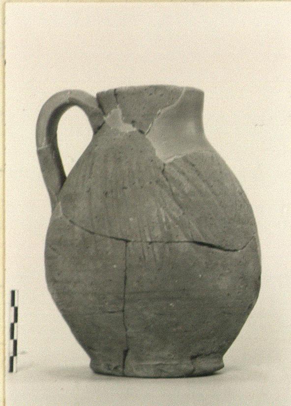 | Description: | Mended from many fragments; fragment of mouth and body missing. Restored in plaster. Chevron gouging on body. Graffito near handle: <graphic> Unglazed. | |