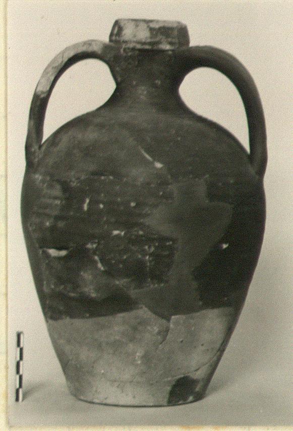 | Description: | Mended from many fragments. Narrow neck. Buff clay. Dull red glaze on upper parts. Cf. the fabric of P 9910 (another import, but not in fact the same ware, JWH). ADDENDA Constantinople white ware with red slip coating; late 5th.-7th. c. series [JWH, June 1981]. | |