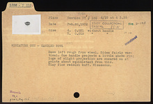 | Description: | Base left rough from wheel; sides fairly vertical; one handle projects a little above rim; lugs of slight projection are smeared on at points about equidistant from this. Clay fine reddish-buff, micaceous. Miniature Votive One-Handled Bowl. | |
