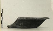 | Description: | Single fragment preserves about half of dish. Flat base oblique wall and everted lip, flat on top. Buff clay; dull reddish glaze overall. ADDENDA Candarli ware. | |