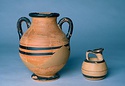 | Description: | Fragments of body and piece of mouth missing; restored. Rolled rim and rising handles; spreading foot. Body reserved with thin glaze wash. Black glaze for mouth and inside neck, handles, foot, and a pair of lines around middle of body; above and below these lines a narrow red line. | |