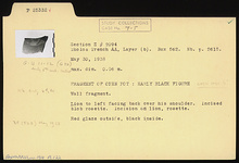 | Description: | Wall fragment of open vase. Lion to left, facing back over his shoulder. Incised blob rosette. Incision on lion, rosette. Red glaze outside, black inside. | |
