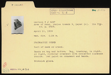 | Description: | Part of neck or stand. Bands on top and bottom. Dog, tracking, to right. At right, circular ornament with connected diamonds inside. Red paint on ornament and bands. Brownish glaze. | |