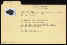 | Description: | Wall fragment from near handle. Part of a large boss projecting from the wall preserved, and of the handle ornament: palmette set horizotnally. No relief contour. Good glaze inside and out. | |