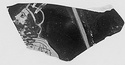 b) Head and shoulders of a man left, probably reclining. Himation and fillet with three spikes in front in applied white. Partial relief contour.