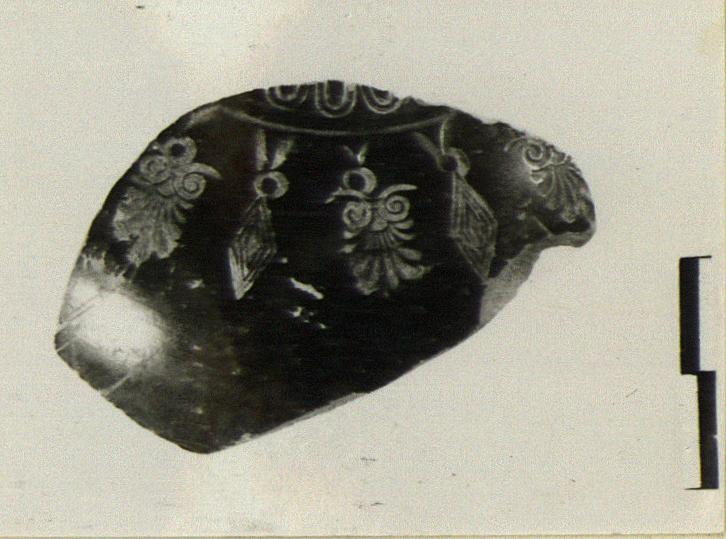 | Description: | Shoulder fragment. Egg pattern; palmettes and diamonds alternating. Good glaze. | |