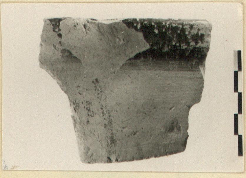 | Description: | Piece of moulded rim and body. Finished edge at left. Rim and edge glazed with wide black, narrow red stripe. Dull black glaze. | |