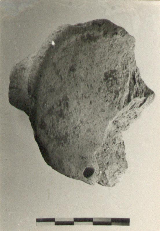 Description:   False neck fragment. Irregularly flat disk on top with rough projections on both sides; cylindrical stand below. A hole made before firing is pierced through the better preserved projection.